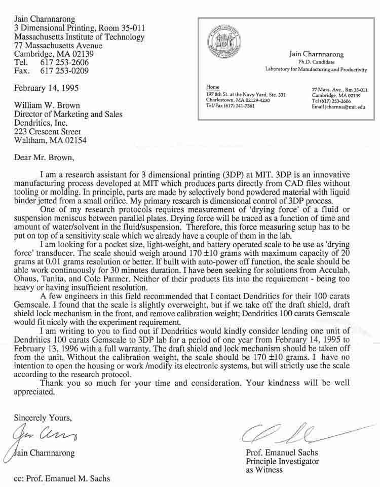Early in 1995, we were approached by a grad student Jain Charnnarong at MIT to assist in their development of what would eventually become stereolithography or 3-dimensional printing as they then called it.  They needed a small scale to measure the forces with which their goop was squirted out.  We couldn't resist, and gave them a free scale, specially modified for their research needs.  We have no idea where it is now!  A research effort we felt honored to support.  It has gone far, really far!  Congratulations guys.