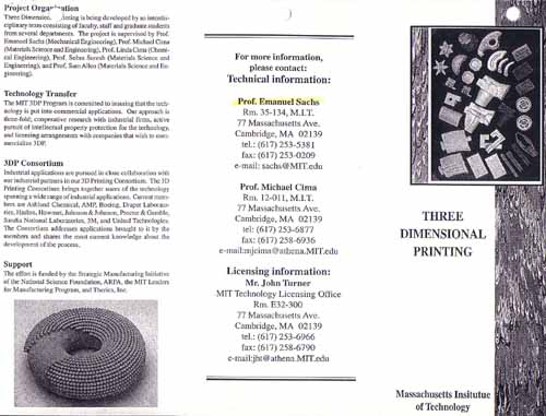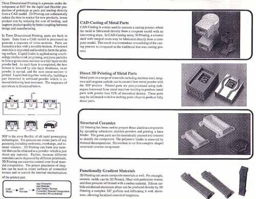 In an explanation from From CAD art to rapid metal tools, Three-dimensional printing, an RP technology invented by MIT mechanical engineering professor Emanuel Sachs and materials scientist Michael Cima, uses electrostatic ink jets to spray polymer binder onto powders, selectively hardening slices of a CAD-defined object layer by layer. Successive layers of powder are spread on top, and the process is repeated until an object is completed. Unbound powder temporarily supports unconnected portions of the component, permitting overhangs and undercuts to be fashioned. "It's basically a process for printing with materials. Instead of red and blue ink, you have, say, aluminum and nickel," Sachs explained.