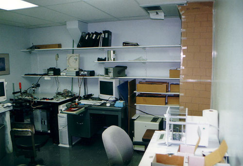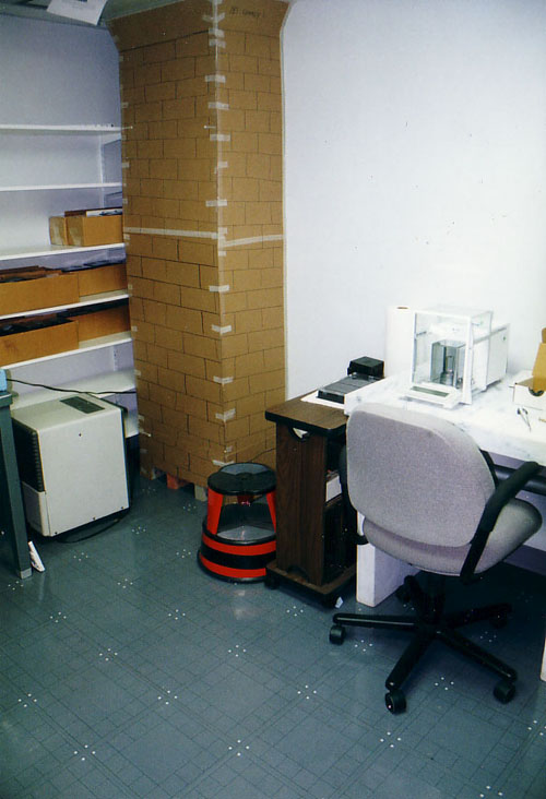 That strange cardboard thing in the corner is actually full of bricks.  At the top an air conditioner blew cool air (summer and winter) down the chimney.  The chimney calmed out the thermal ups and downs, allowing the actual temperature in the room to hold very steady, as was required for stable calibrations.
