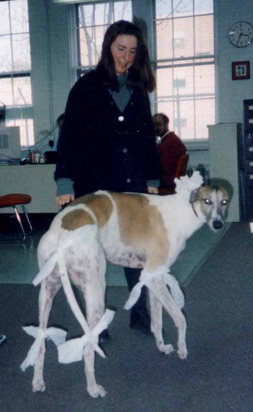Happy's life pretty much paralleled that of Dendritics as a production company. He was born May 24, 1992. Joined us in September 92 as a rare greyhound puppy aged only 15 weeks. Celebrated his 10th birthday in May 2002 and died July 28, 2002. He was a major force in our interviewing process, passing judgment on one and all without concern for political correctness. You had to at least think he was OK, or how could you survive? Irina and her daughter were initially terrified of dogs, but he won them over with his sweet side.