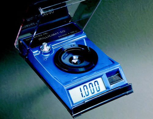 The world's first portable scale for diamonds is Millicarat -50. The new, high resolution of .001 carats to 50 carats is a standard previously found only in more expensive and larger balances. Millicarat -50 is 5"x3"x1" and runs on a 9V Alkaline battery. The technological breakthroughs and new features such as a low battery indicator, 30 minute turn off and innovative high stability make Millicarat-50 ideal for weighing diamonds in retail, trade show and travel environments.
